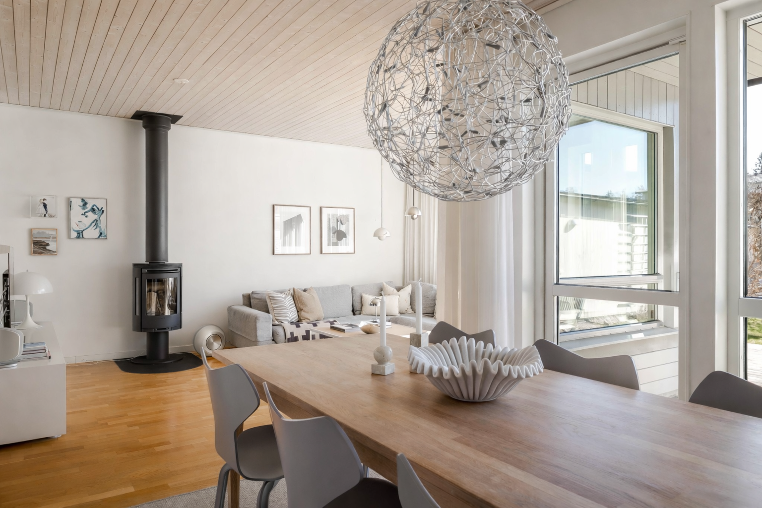 Bostadens vardagsrum är en naturlig samlingspunkt med kamin, stora fönsterpartier från golv till tak och direkt utgång till altanen och den grönskande baksidan. Här finns generösa ytor med plats för både en stor matplats och en rymlig soffdel – perfekt för sociala tillställningar och familjeliv.