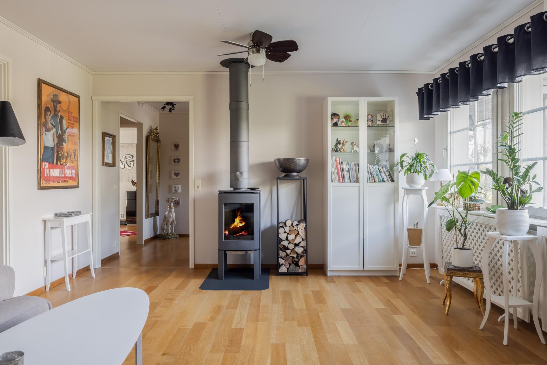 Det finns ett stort vardagsrum som har en härlig kamin som värmer skönt under vinterhalvåret. Här finns det tre stora fönster som ger ett fint ljusinsläpp och gott om plats för både soffgrupp och matsalsbord för den som önskar. På golvet ligger det parkett och väggarna är målade och tapetserade .