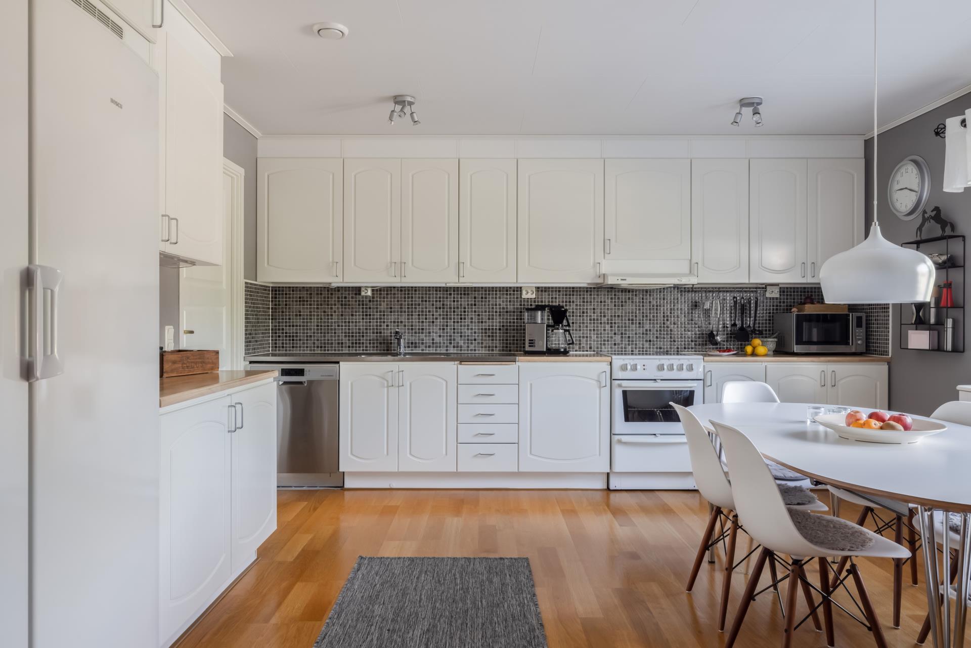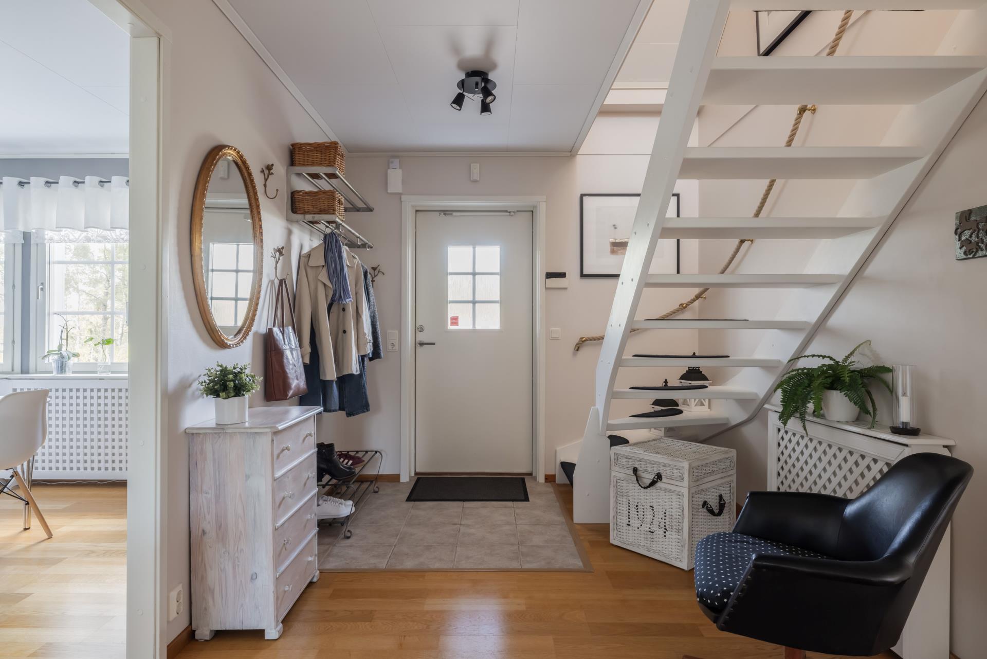 I Entréplan välkomnas du av en rymlig hall där du kan hänga av dig ytterkläder. Golvet är klinkers och därefter parkett. Direkt till höger ligger det stora köket som har två stora fönster som gör att det är rikligt med ljus. Här finns det gott om plats för många middagsgäster. Köket har gott om förvaringsutrymme, fullhöjd kyl och frys, över arbetsbänken sitter en fin mosaik och på golvet ligger det parkett. Från köket når du husets tvättstuga som är utrustad med tvättmaskin och torktumlare, samt torkskåp och en tvättho. Här har du även en separat ingång från utsidan.