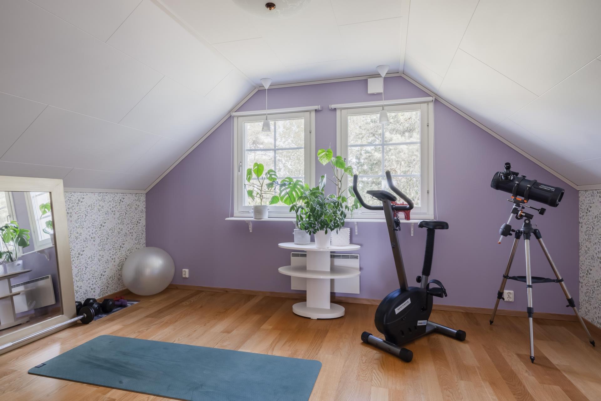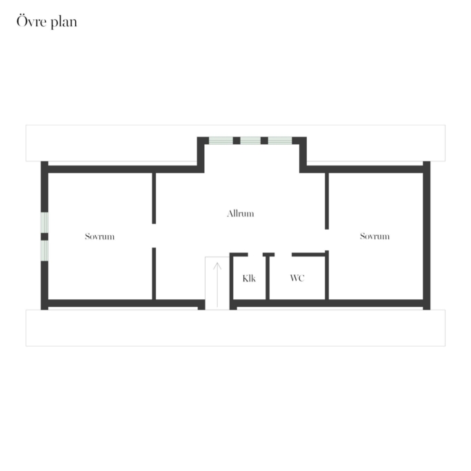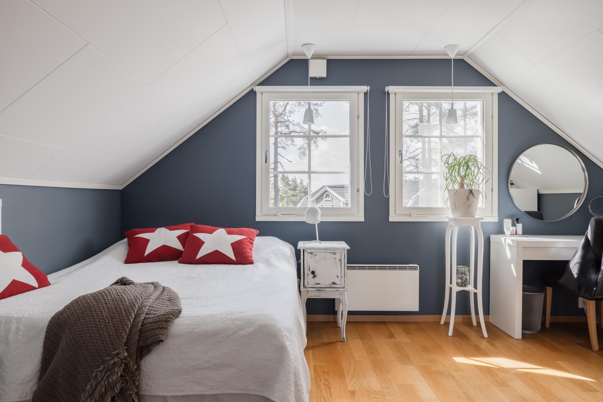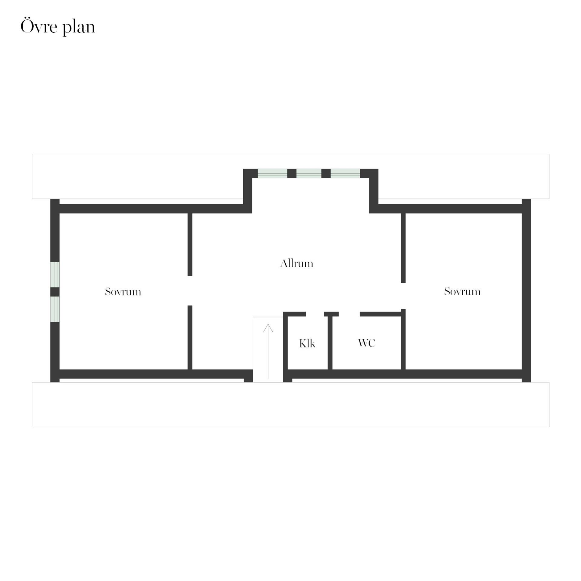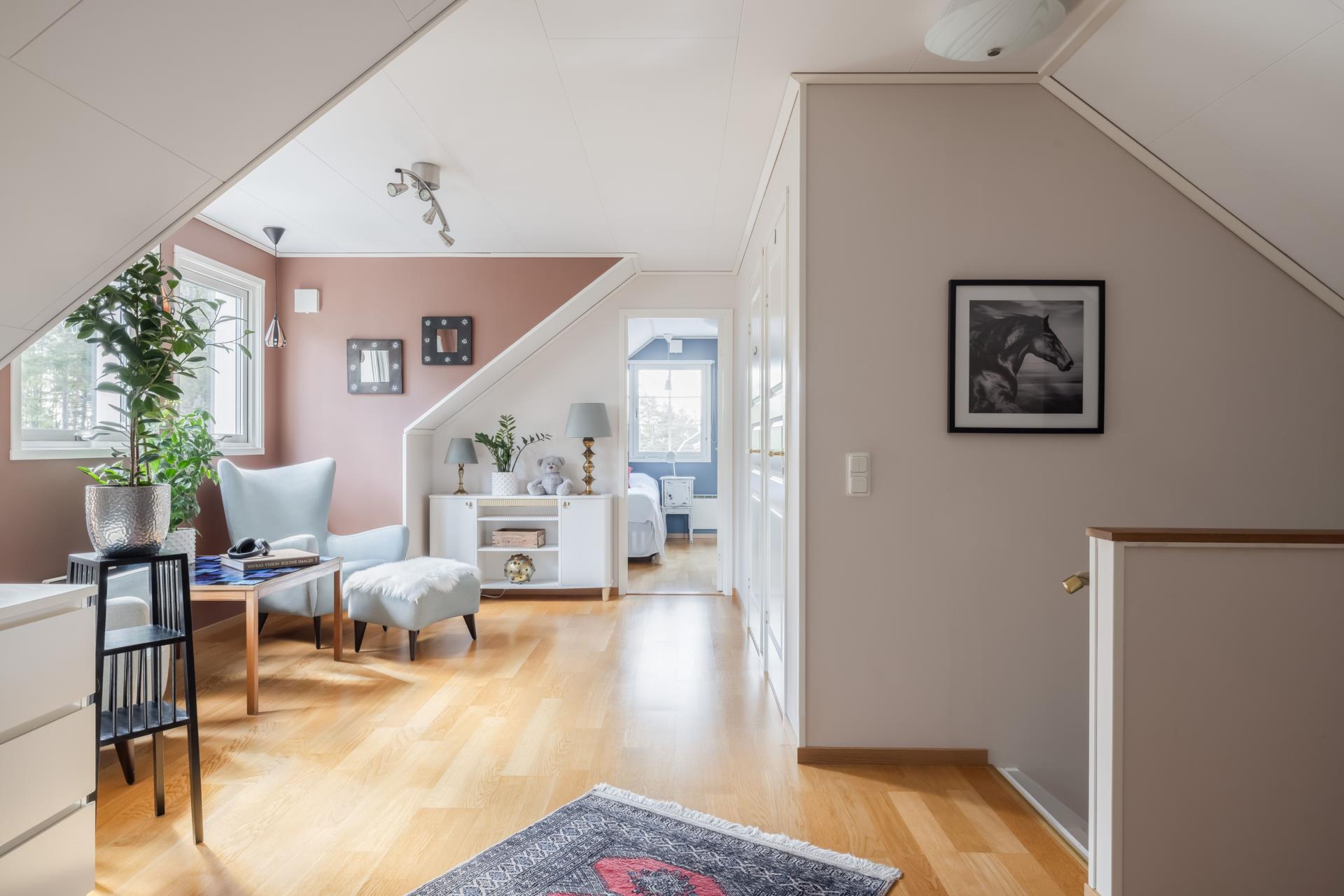 En fin trätrappa leder dig upp till det övre planet som består av två stora sovrum som har två fönster vardera och ett allrum med tre fönster samt badrum som har en dusch, wc och handfat, här är det klinkers på golvet med golvvärme (el) och kakel på väggarna. Golven i övrigt på övre plan är genomgående parkett och väggarna är målade och tapetserade. Här finns också en klädkammare som ger bra klädförvaring.
