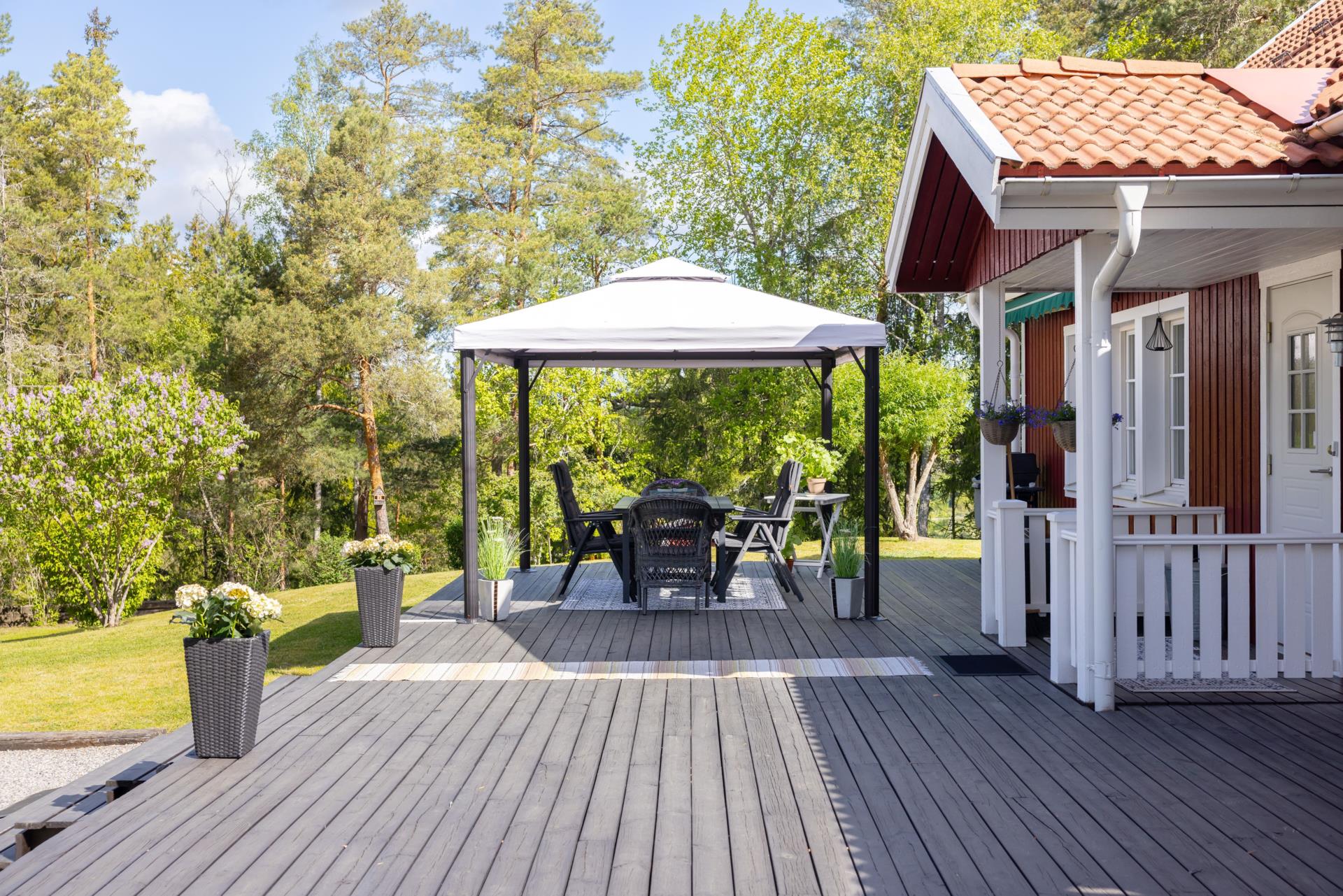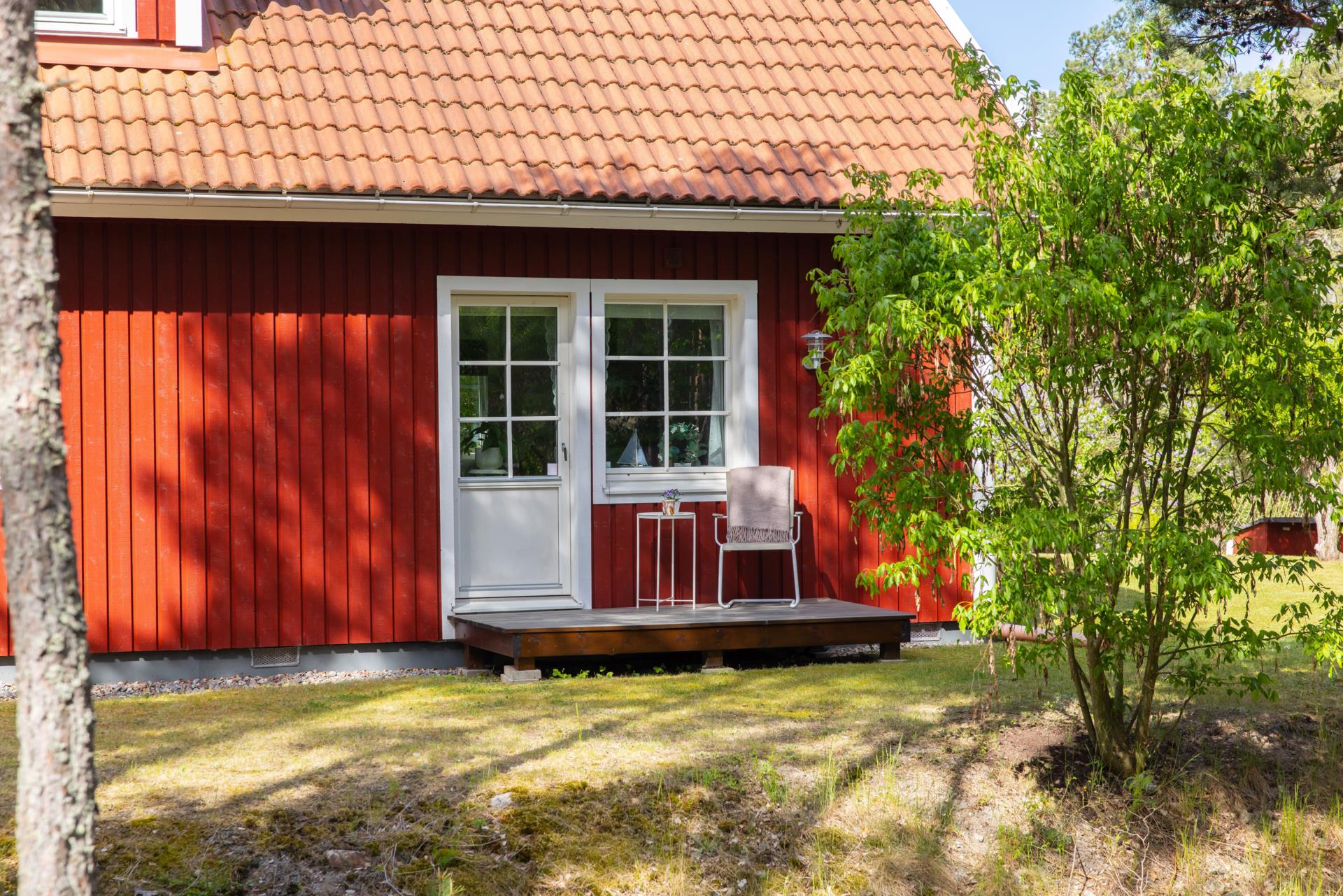 Den trevliga entrén omges av ett stort trädäck med sol från tidig förmiddag till kväll under sommaren. Här finns det gott om plats för härliga grillkvällar och umgänge för ett större sällskap.