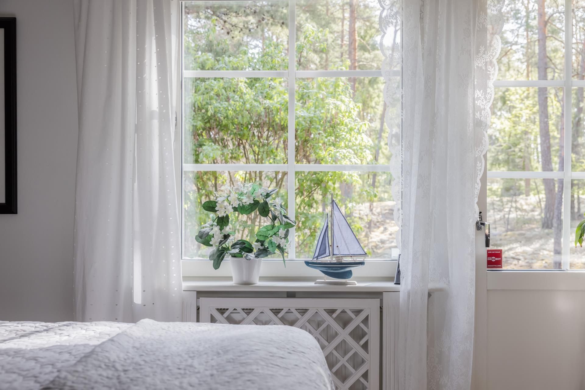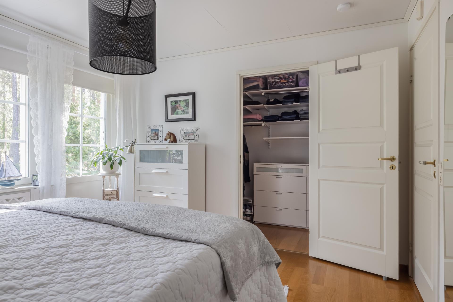 På entreplan ligger masterbedroom, ett stort, lugnt och fint rum med både ett stort fönster och en balkongdörr som gör att du kan kliva direkt ut i den vackra skogen om du önskar. Här finns även en liten terrass där du kan sitta och ta morgonkaffet och lyssna på fåglarna. I anslutning till sovrummet ligger en rymlig klädkammare så här har du mycket gott om förvaring.