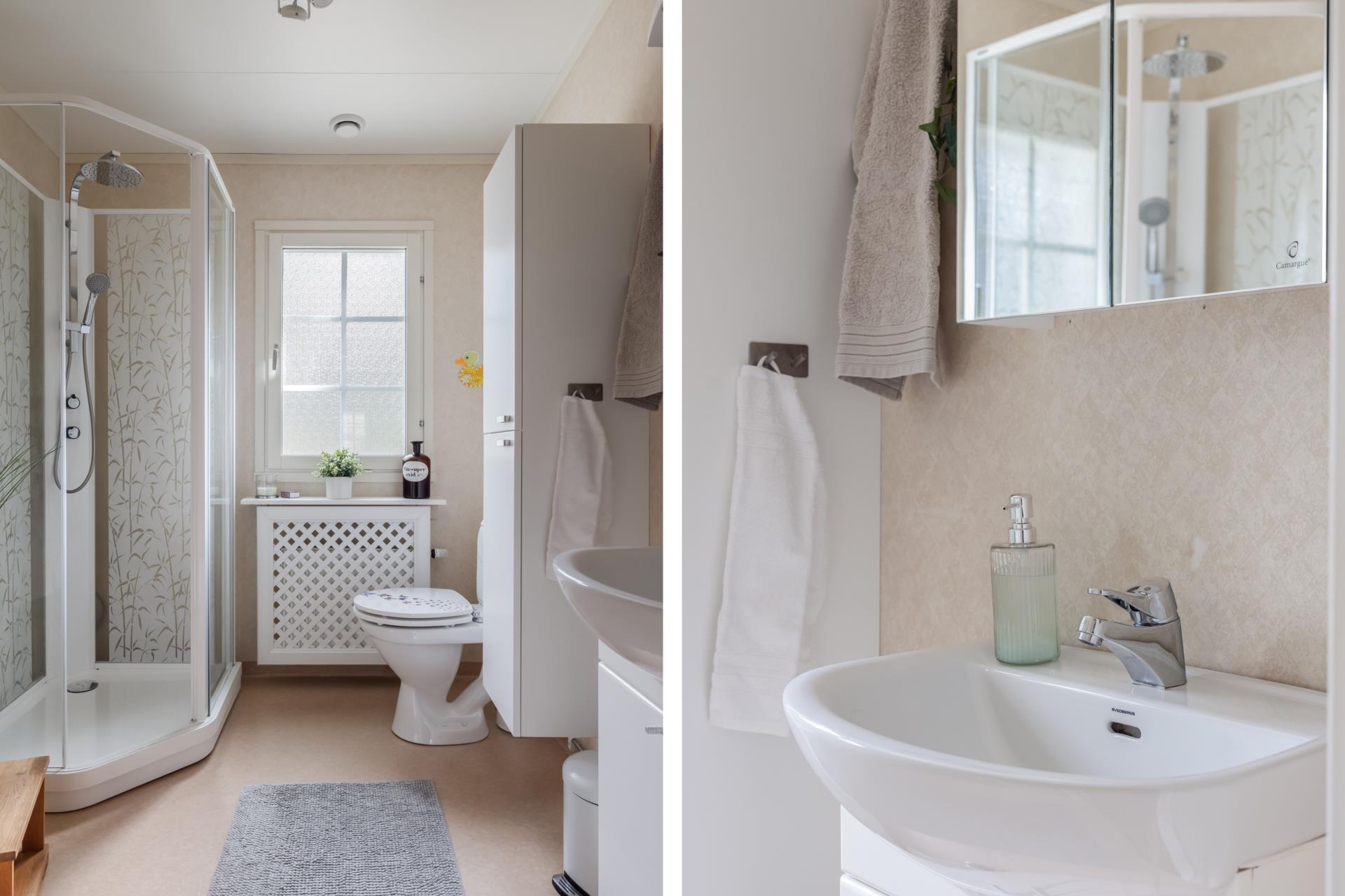Nedreplan har även ett duschrum med Wc och handfat. Här är det en Linolium matta på golv och väggar samt skåp för förvaring.