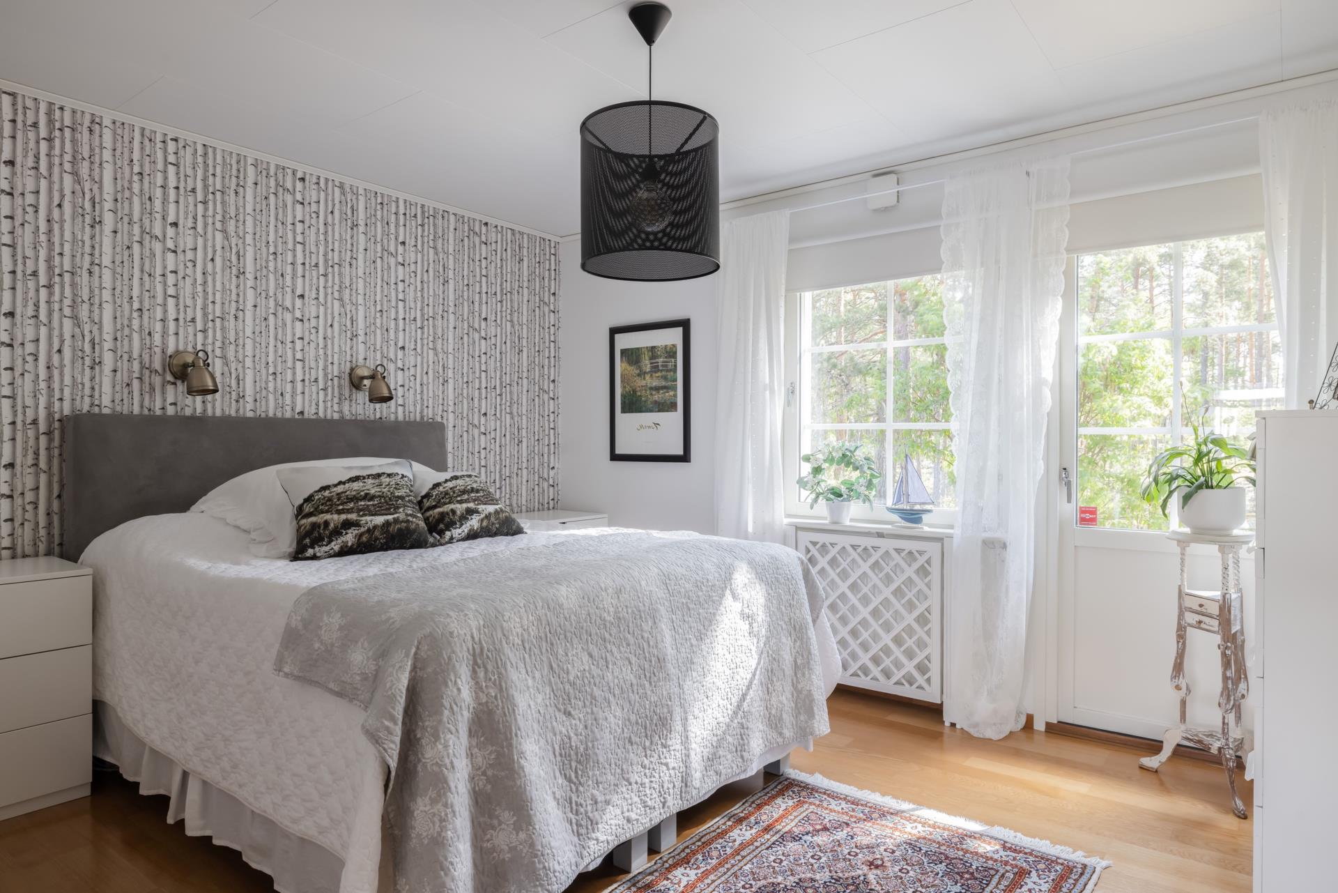 Från hallen till vänster har du ett sovrum med ett stort fönster, här finns det parkettgolv och väggarna är målade och en tapetserad fondvägg.