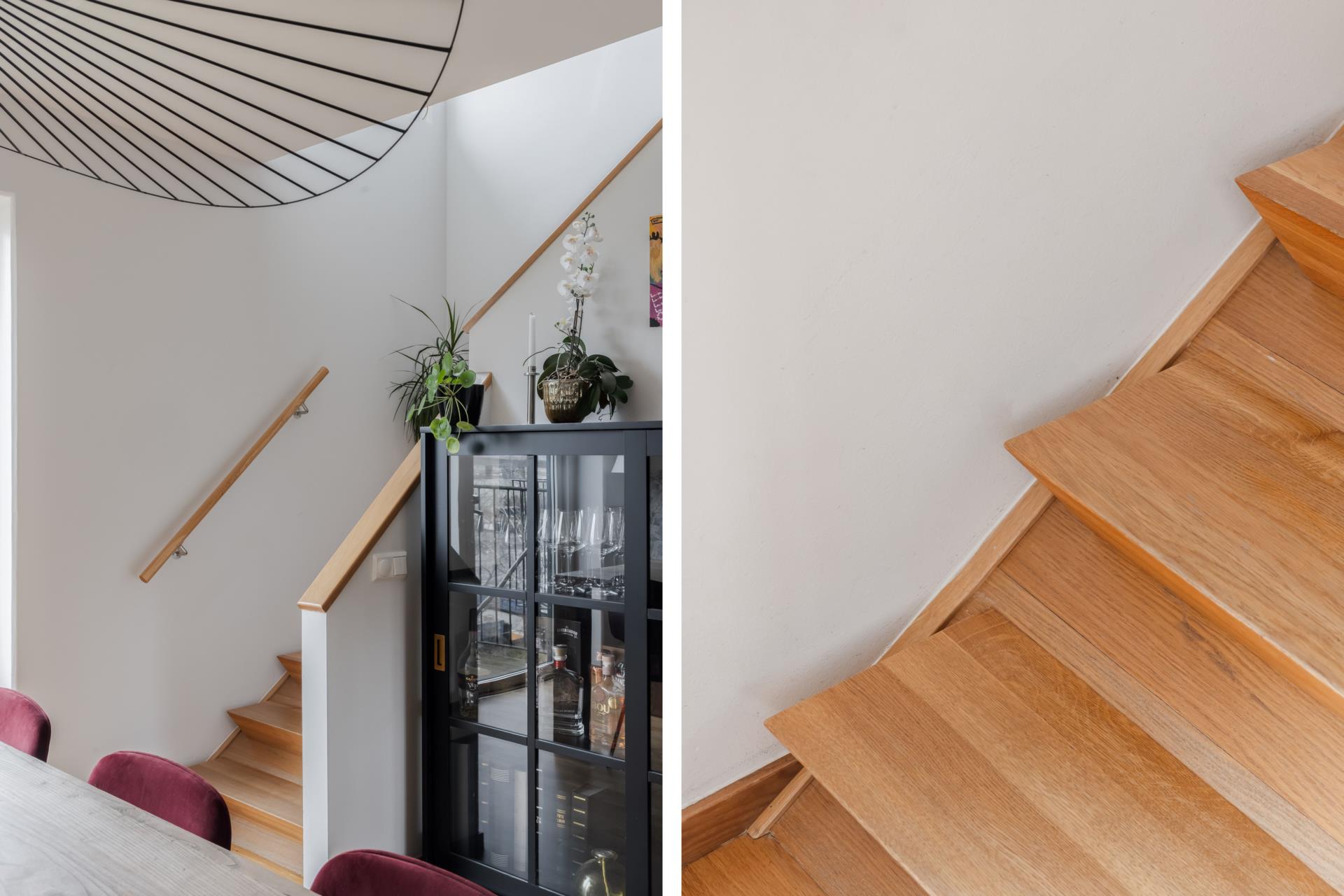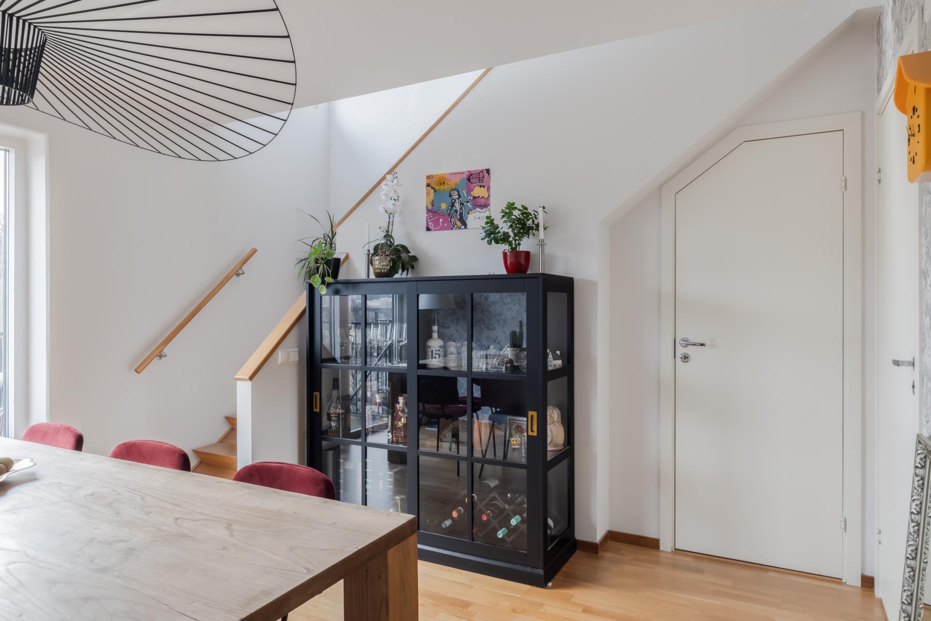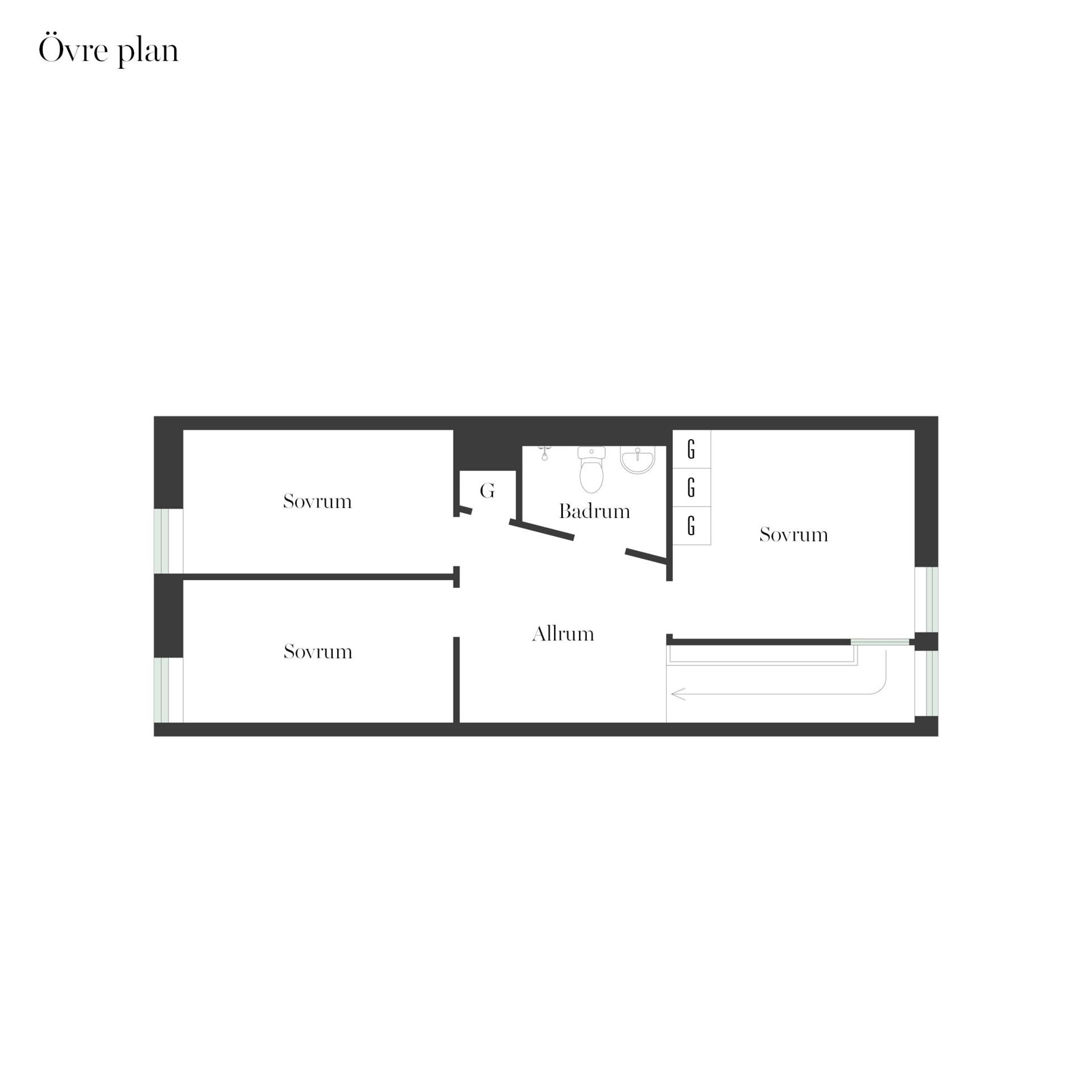 Från detta plan går en snygg och unikt designad trappa upp till övre plan. Här möts man av ett allrum med naturlig plats för både soffa och tv om så önskas, perfekt ifall sällskapsyta behövs för såväl barn som vuxna. Det finns tre sovrum på detta plan varav ett större som lämpar sig som master bedroom. Ytterligare ett badrum finns också på detta plan.
