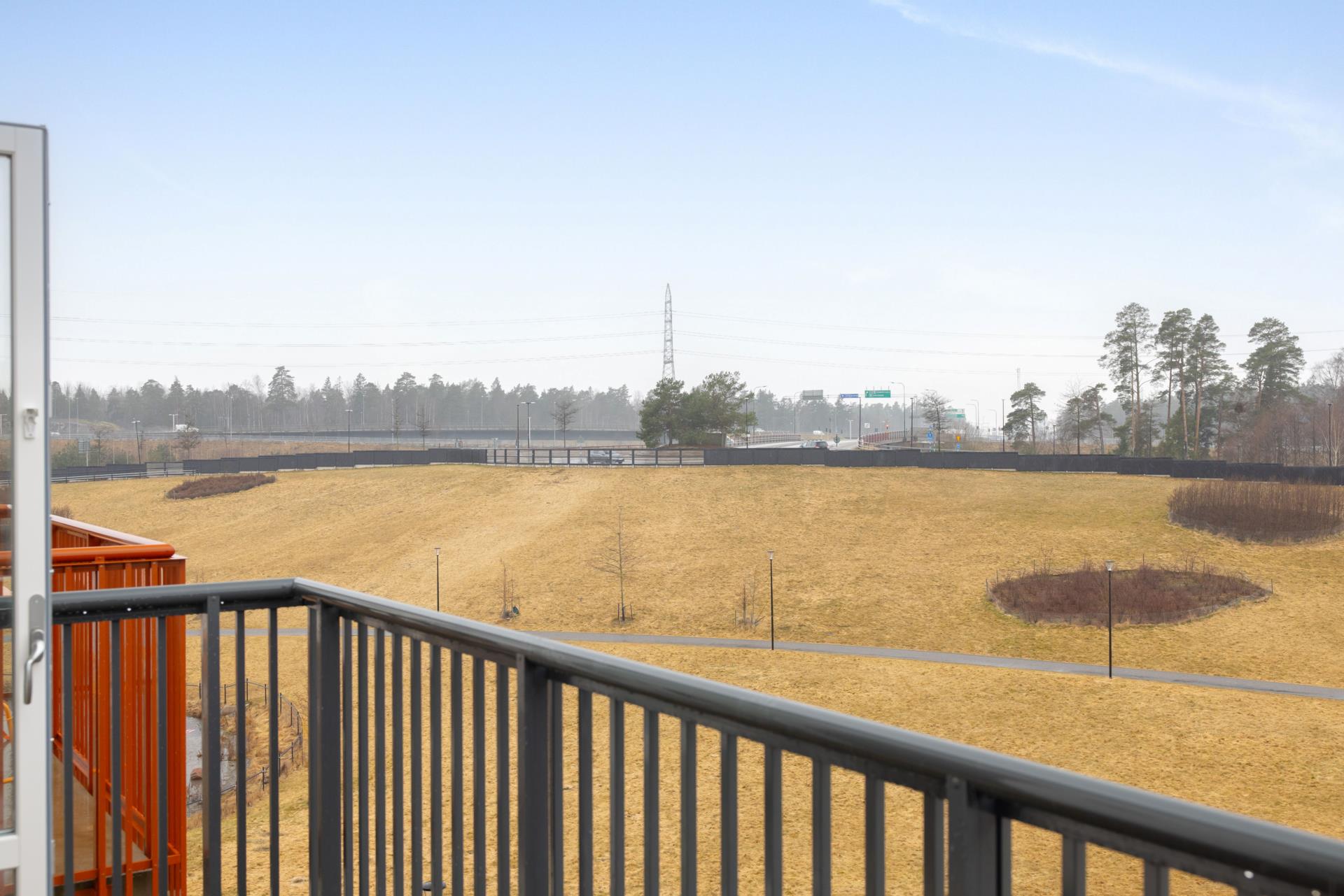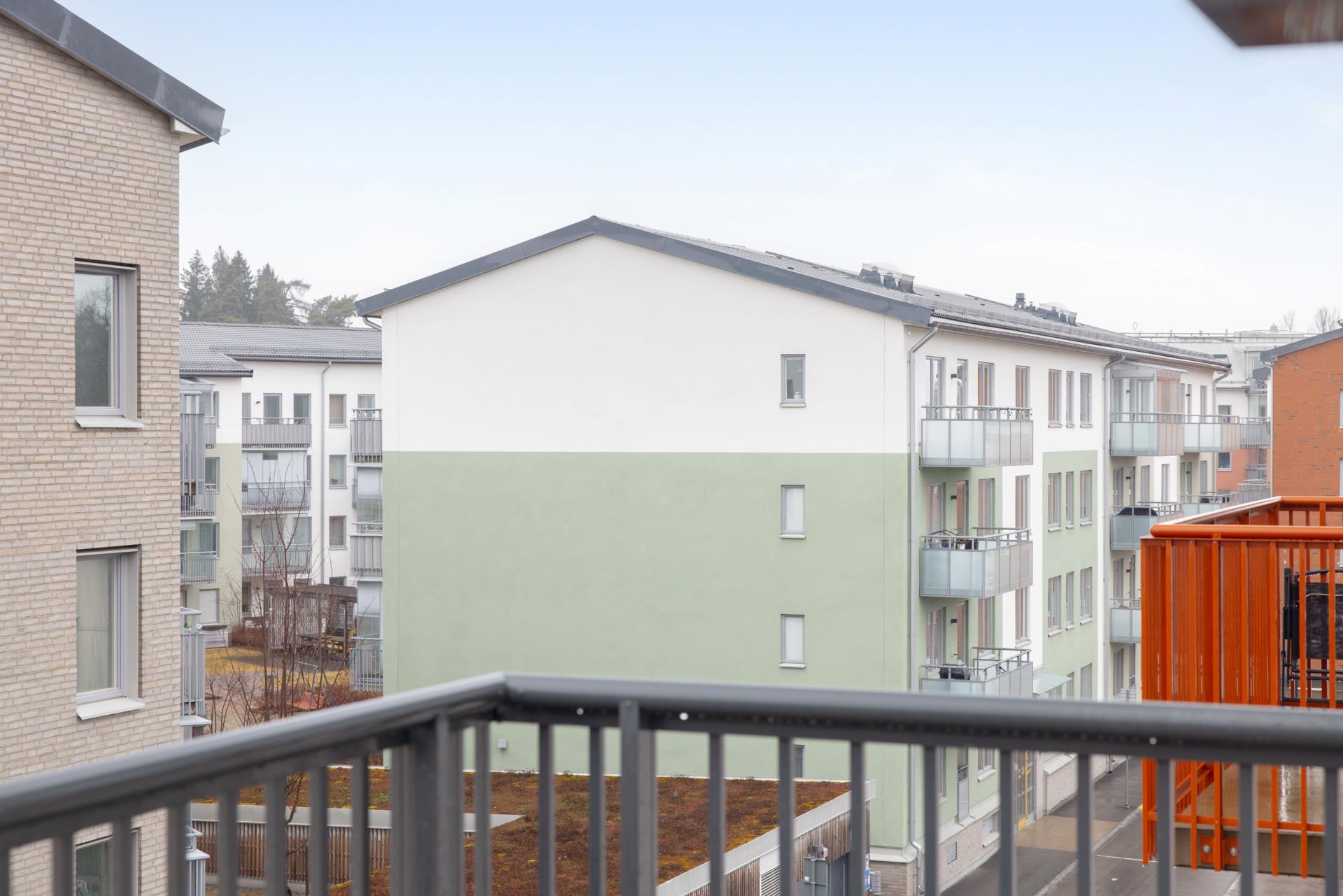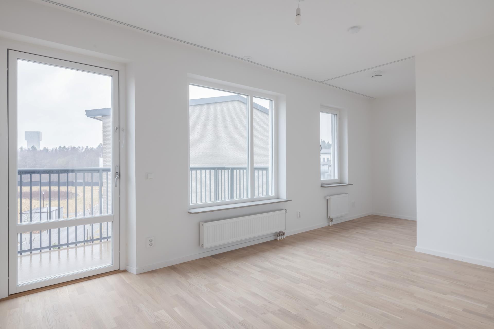 Från vardagsrummet nås den härliga balkongen i västerläge, där eftermiddags- och kvällssolen kan avnjutas med utsikt mot grönska.