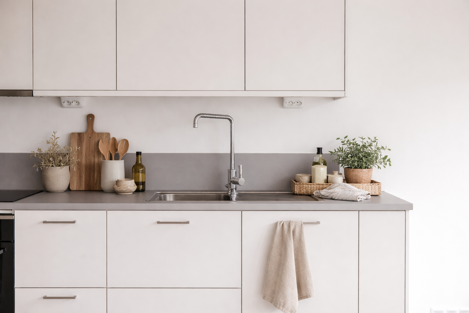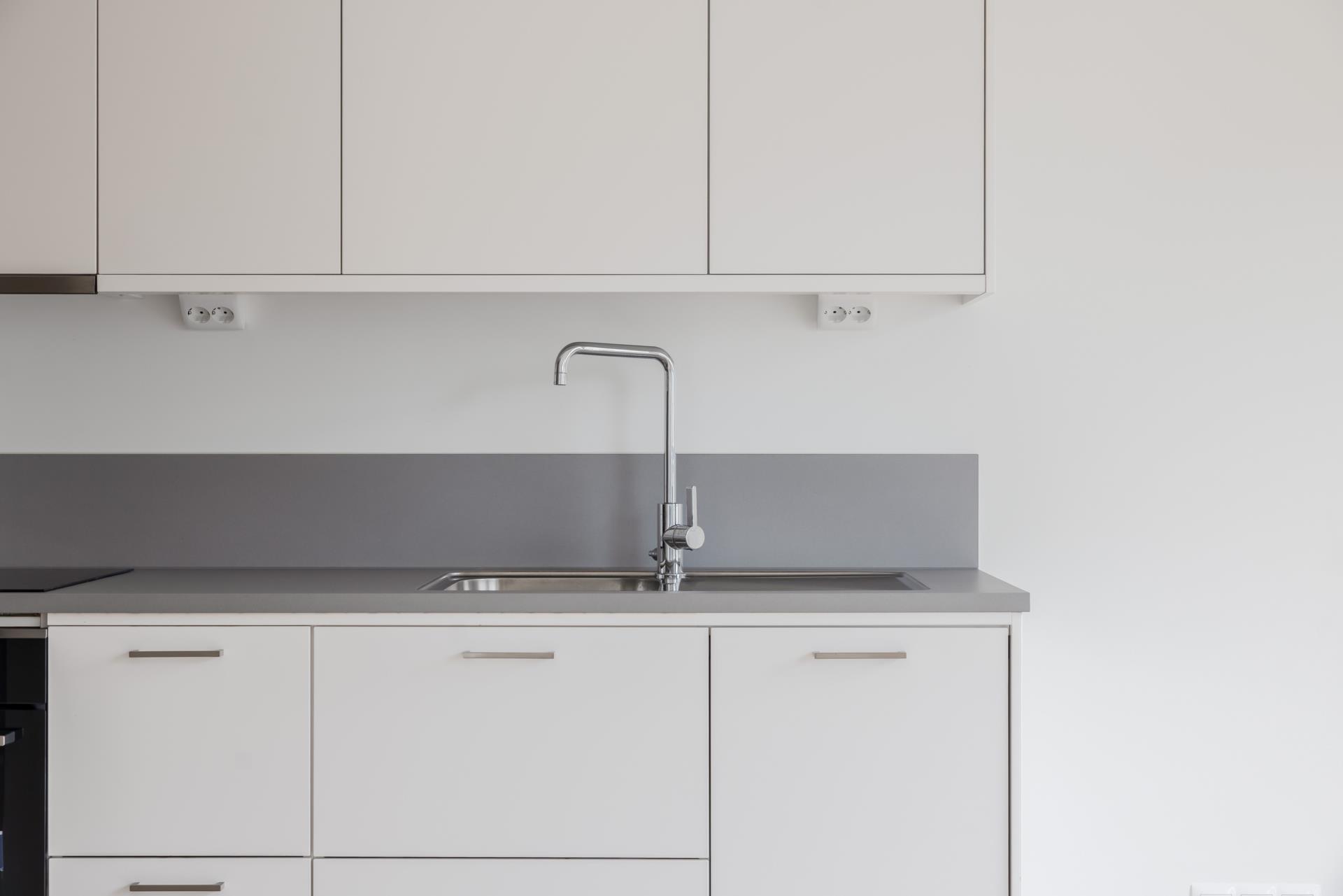 Interiören präglas av en modern och tidlös design med genomgående mattlackad ekparkett och vita väggar. Köket är stilrent med grå laminatbänkskiva och goda arbetsytor. Badrummet är helkaklat med grått matt klinker och vitt matt kakel samt utrustat med kombinerad tvättmaskin och torktumlare från Electrolux för extra bekvämlighet.