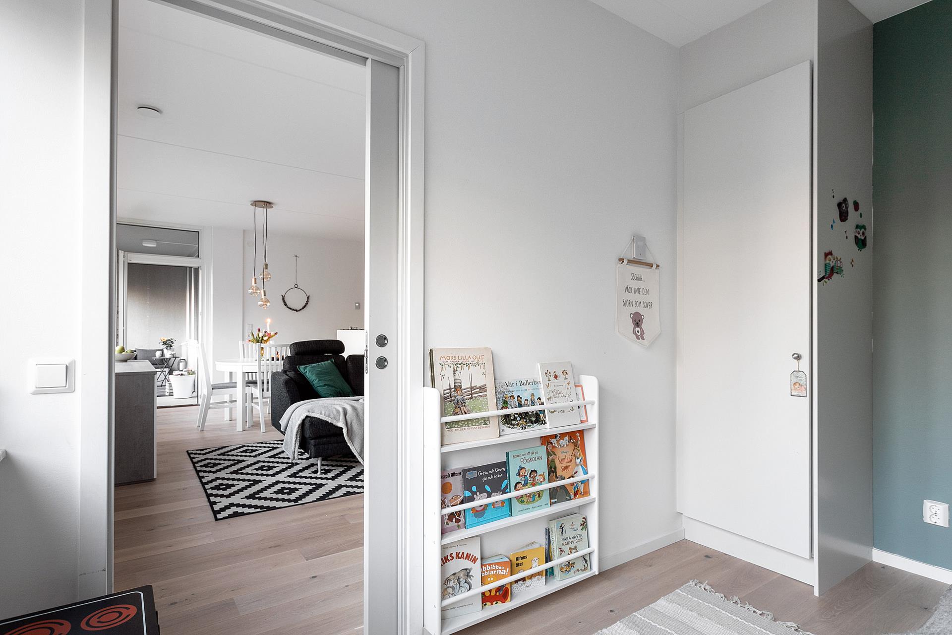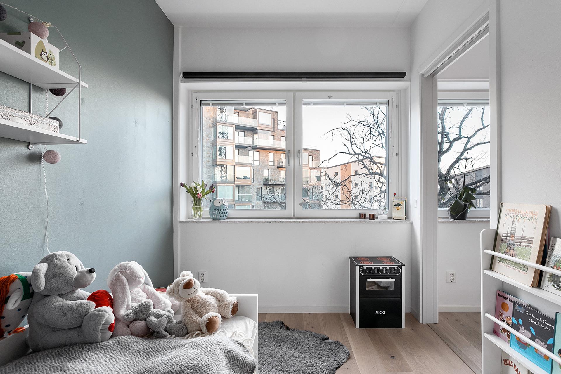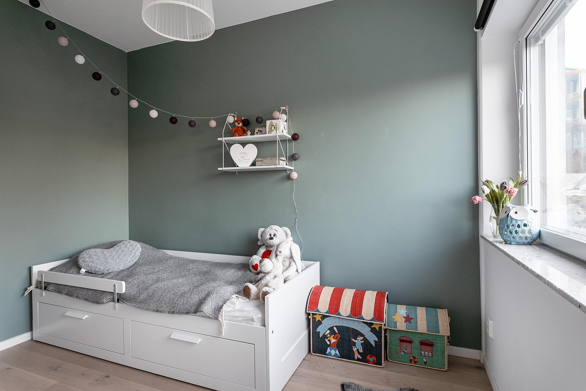 SOVRUM 1 är ett bra barnrum med plats för både säng och skrivbord med mera. Rummet har stort fönsterparti längs kortsidan mot vattnet och är fint inrett med parkettgolv och målade väggar i grågrönt. Här finns en inbyggd mindre garderob. En skjutdörr mot vardagsrummet sparar plats.