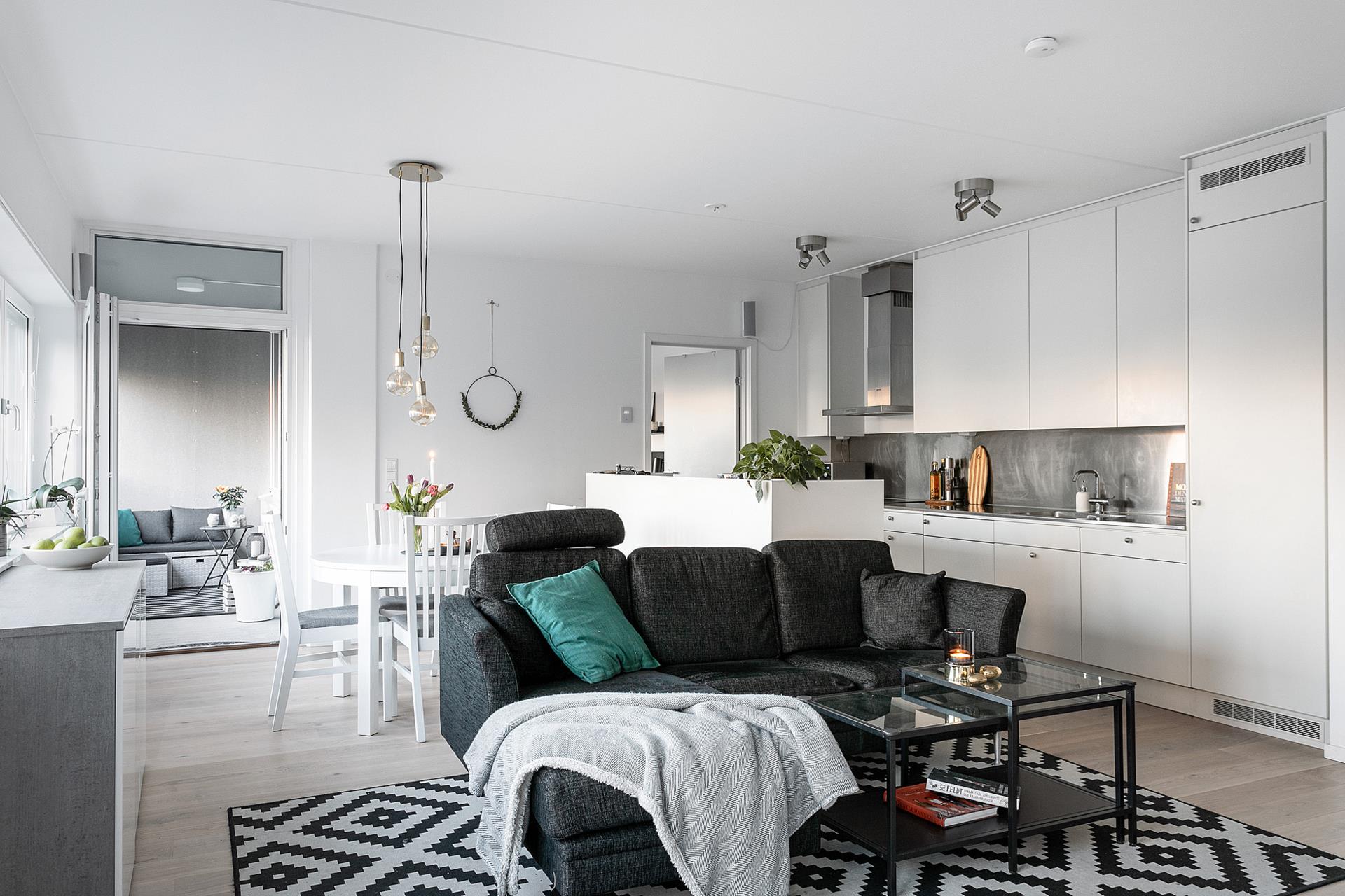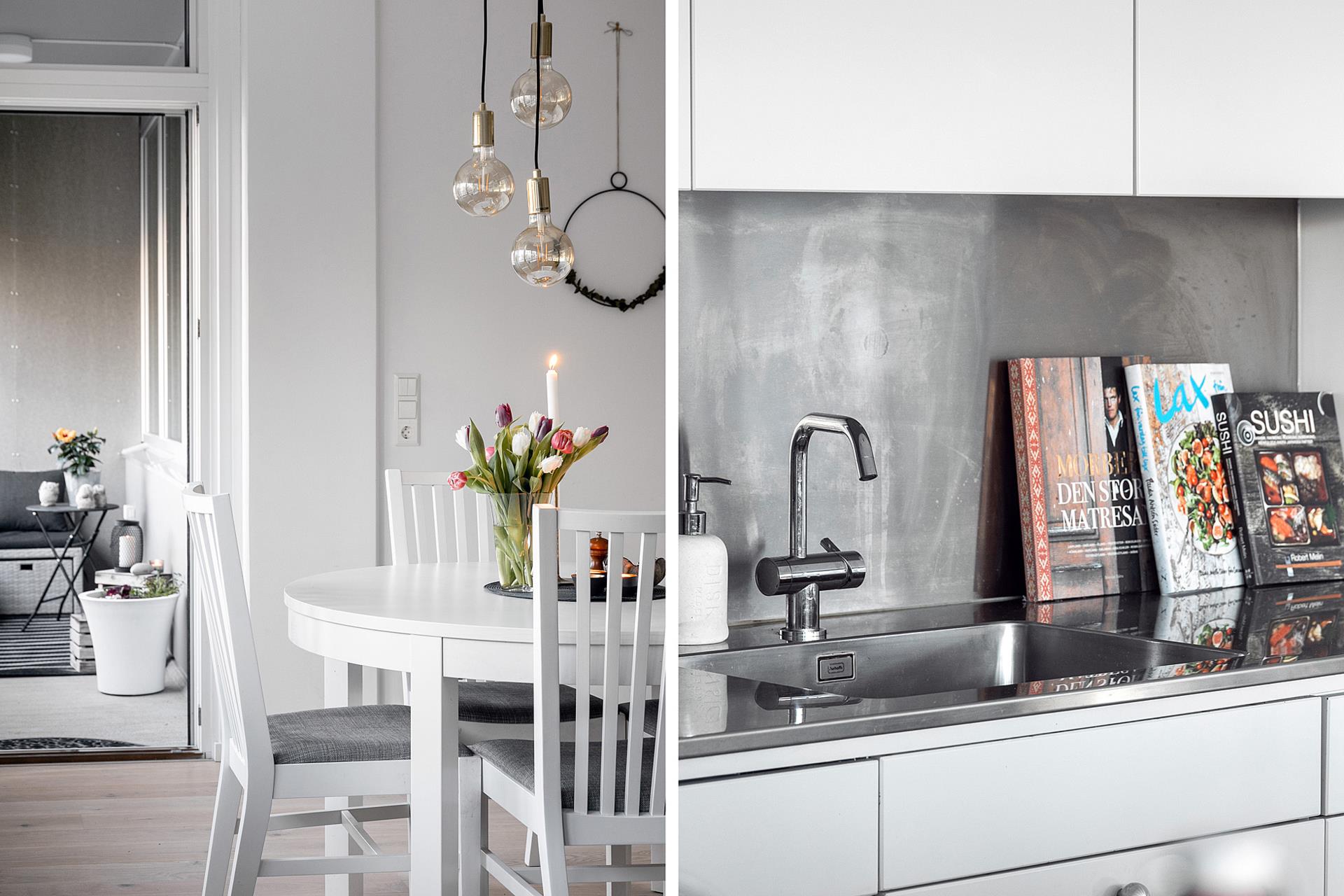 KÖKET är utmärkt planerat med generös skåpinredning och rejält med arbetsytor, trots att köket som helhet tar ett fåtal kvadratmeter i anspråk, vilket ger maximal plats till umgängesytorna. En del av lösningen är köksön som ger bra med extra förvaring och arbetsyta samtidigt som den skapar en naturlig avgränsning mot loungedelen. Skåpinredningen är vit med snyggt kontrasterande stänkväggar ovanför arbetsbänken.