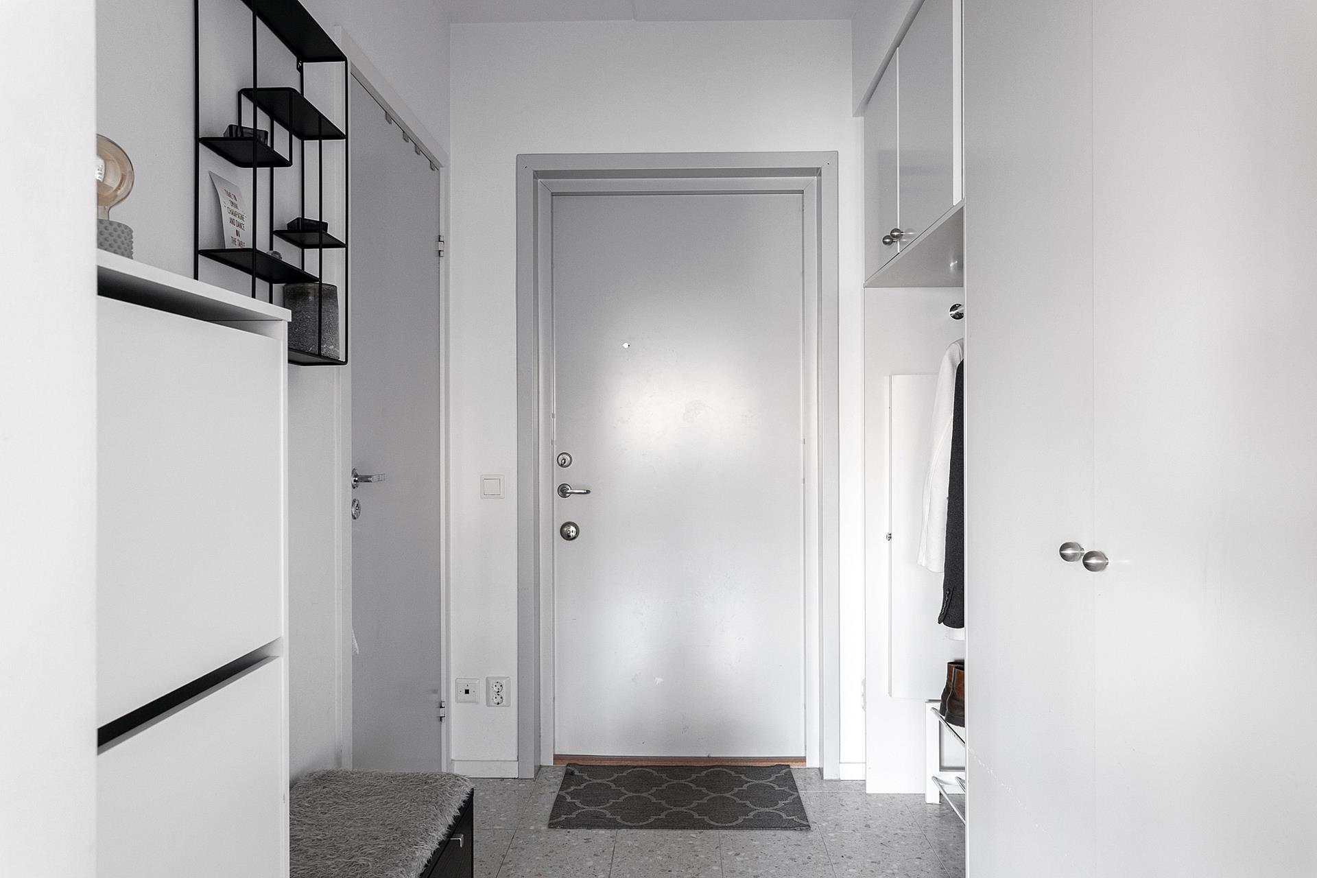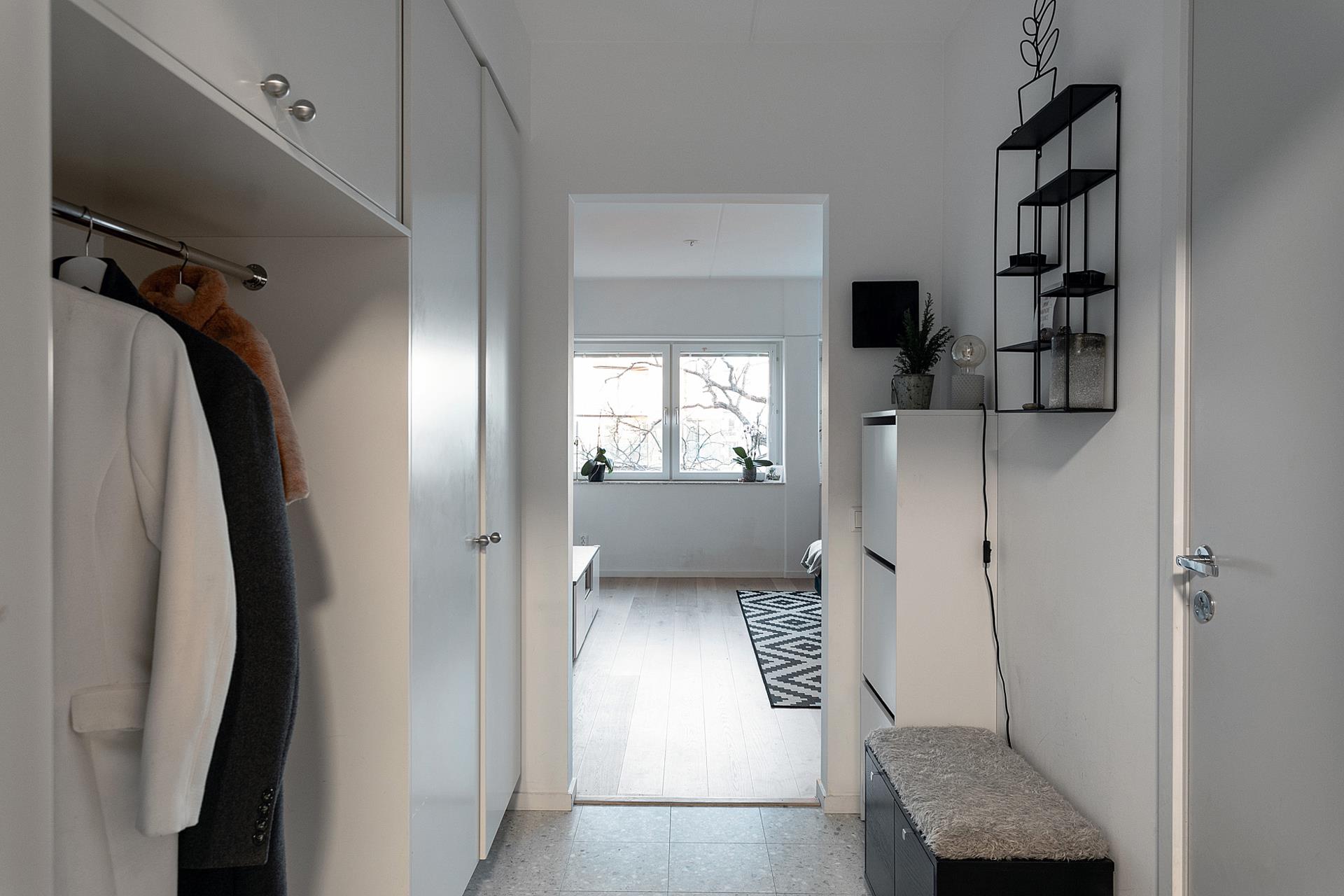 HALLEN är yteffektiv och praktisk med garderober och överskåp som ger bra förvaringsutrymme samtidigt som de ramar in nischen för ytterkläder och skor. Stengolvet är både elegant och robust, här behöver du inte oroa dig för att gå in med grus under skorna. Väggarna är vita.