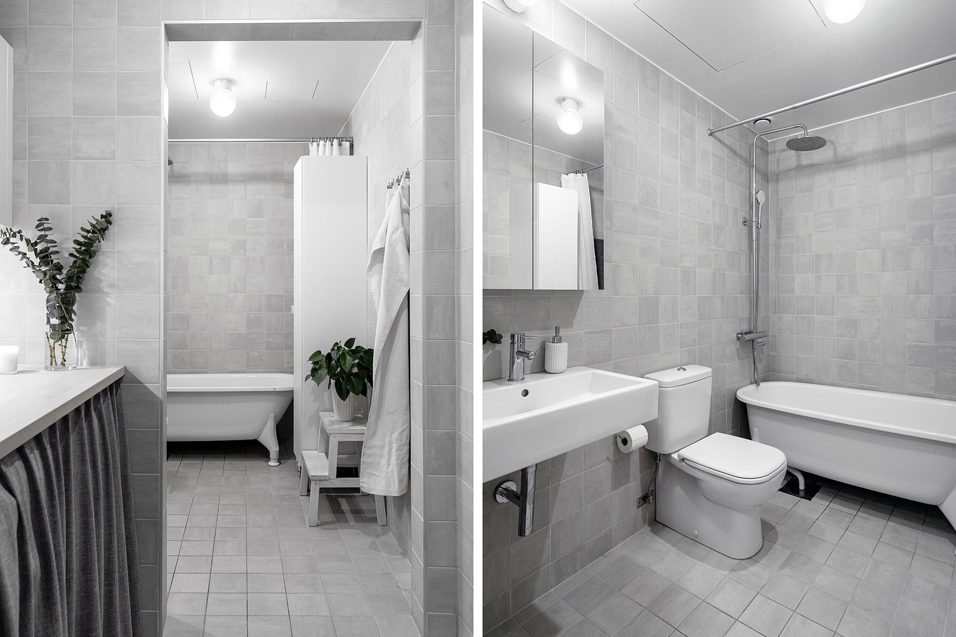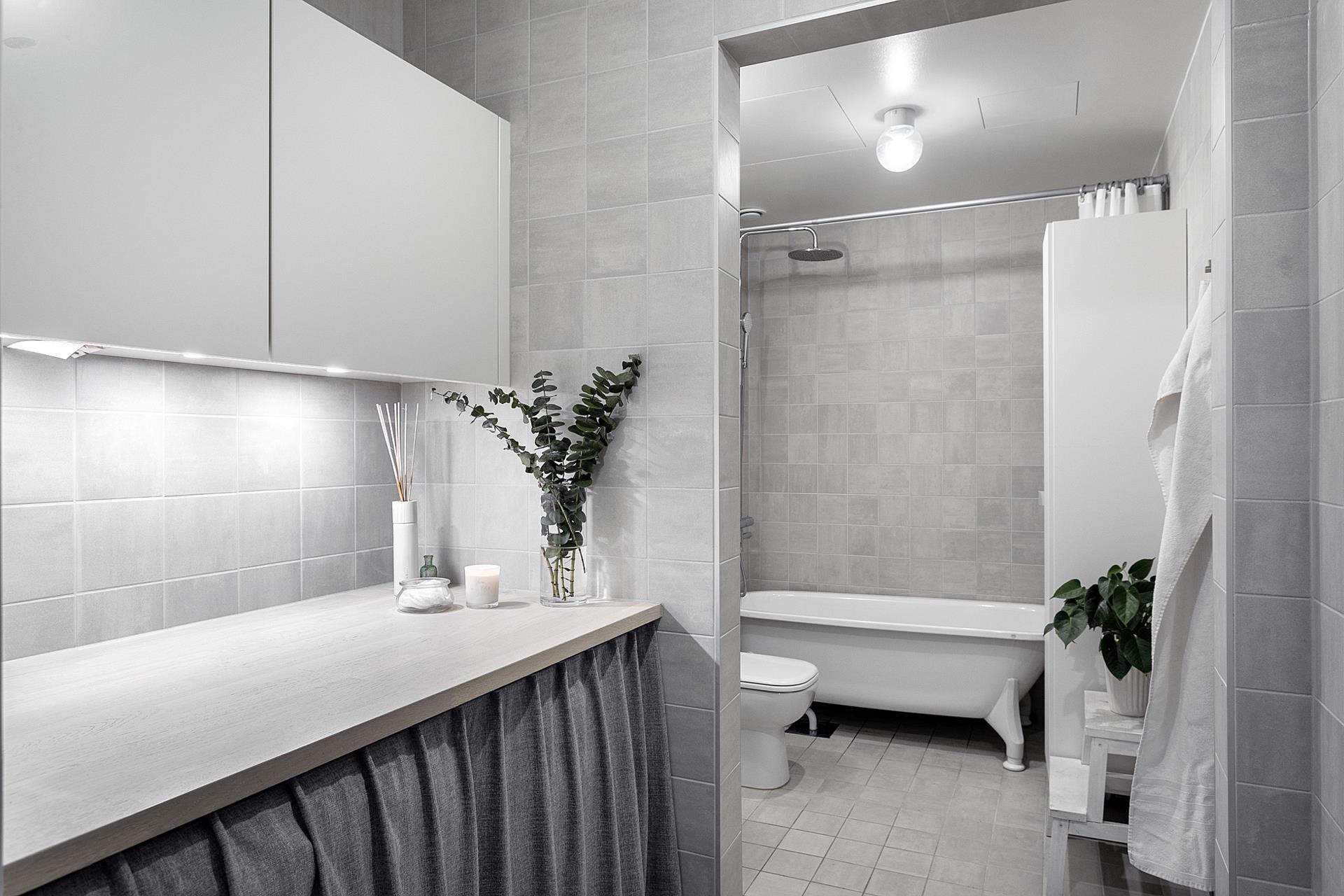 BADRUMMET är stort och välplanerat med en avgränsad tvättdel före själva badrummet. Hela utrymmet har ljusgrått klinkergolv och matchande helkaklade väggar med smakfulla gråa plattor. Tvättdelen är välinredd med arbetsbänk och förvaring ovanför maskinerna. Badrummet har badkar och gott om förvaringsplats.