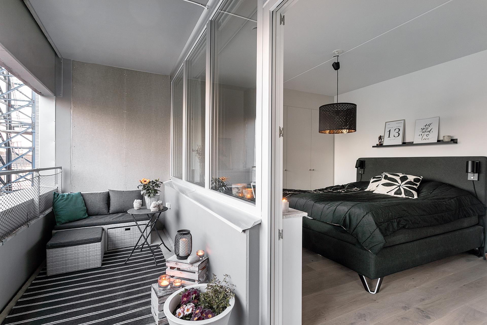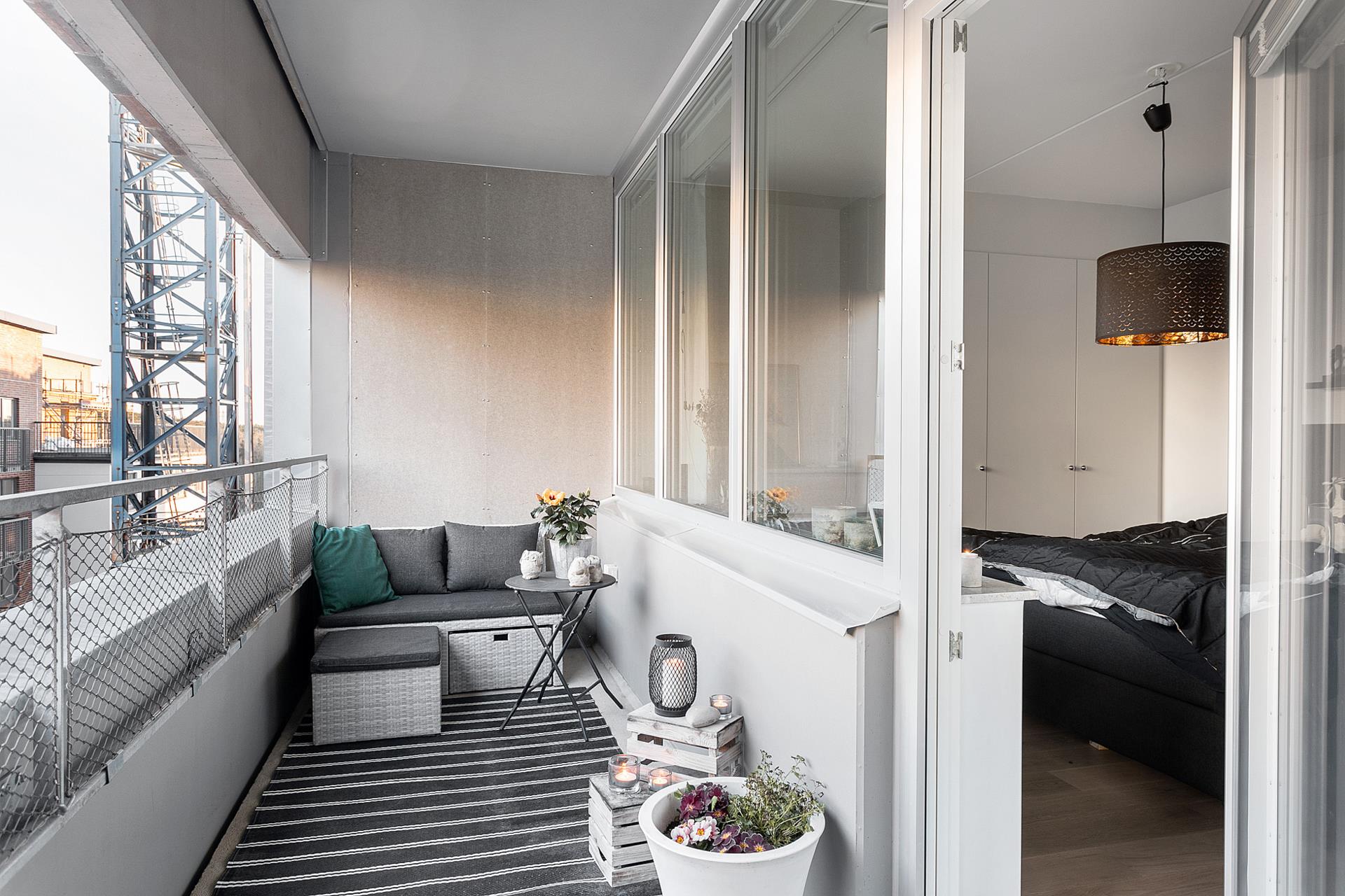 BALKONGEN är hela 7,5 kvm vilket ger en långsträckt och bra yta för ett litet bord och sköna stolar, där man kan njuta av mysiga frukoststunder på sommaren då balkongen har morgonsol. På kvällen får man istället skugga och svalka till middagar eller kvällsmys härute. Det höga och tämligen fria läget ger en trevlig utsikt ut över sluttningen, kajen och vattnet.