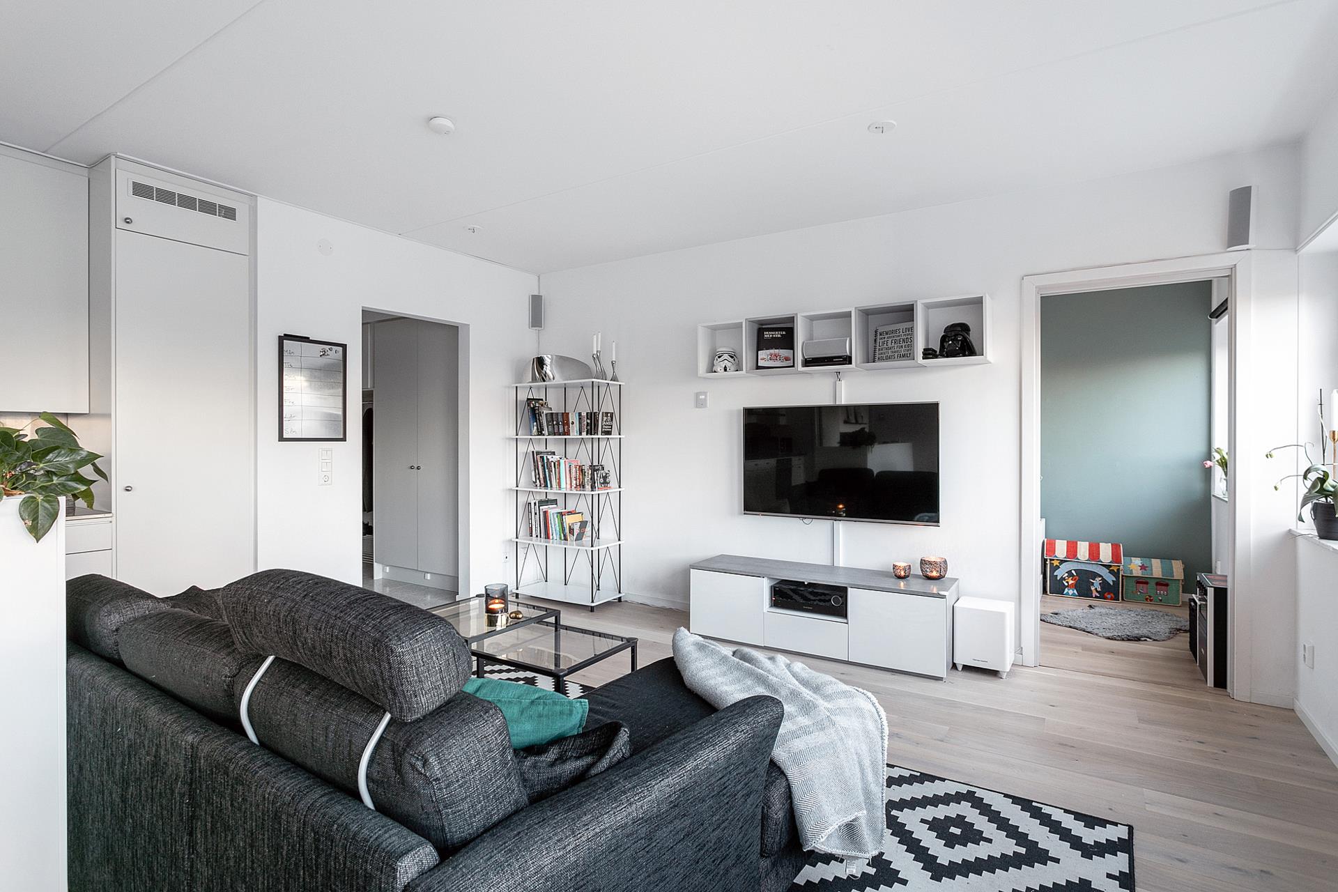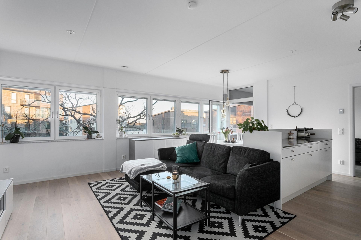 Kök och vardagsrum i helt öppen planlösning skapar en charmig och trivsam sällskapsdel som rymmer en rejäl loungedel och matplats med mera utan att det känns trångt. Även master bedroom är väl tilltaget med stora fönster som släpper in ljuset. De två sovrummen ligger i varsin ände av bostaden vilket ger en bra avskildhet.