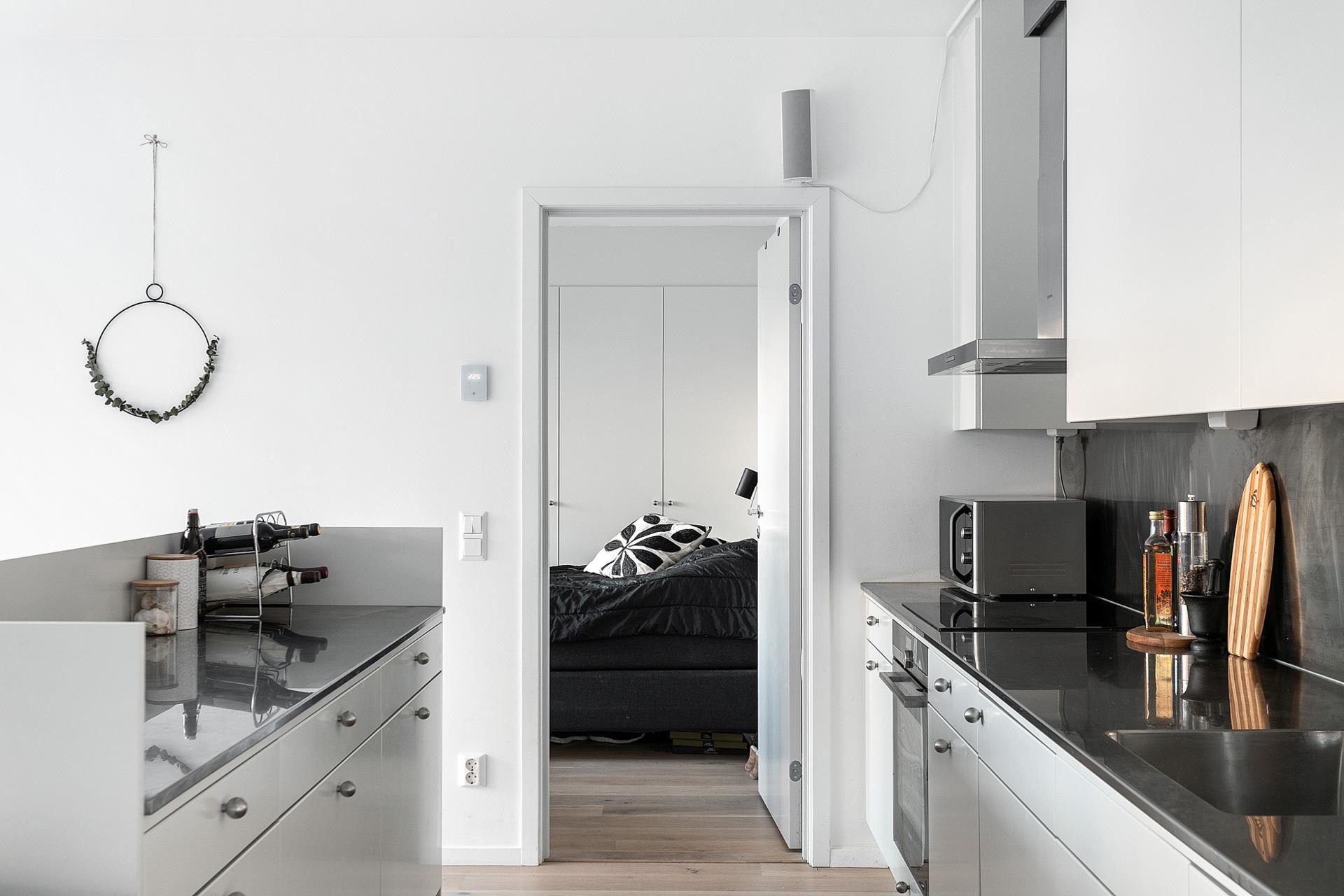 Hela köket har integrerade vitvaror för en stilren känsla. Köksön ger extra arbetsyta och förvaring och stänkskydden ovanför arbetsbänken är lätta att rengöra och ger köket mycket karaktär. Bostaden går i vitt utom lilla sovrummet som har väggar i en sofistikerad grågrön nyans.