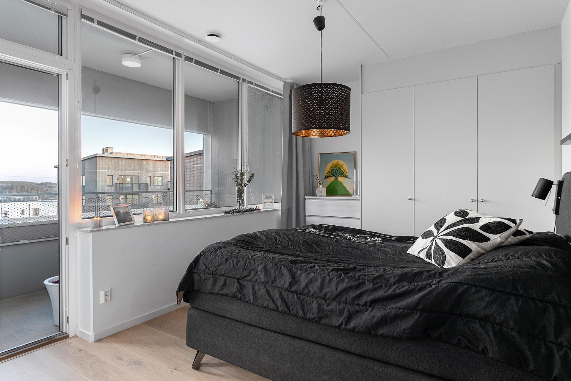 SOVRUM 2 är ett härligt master bedroom, också med fönster längs hela balkongen och sjösidan vilket ger ett massivt ljusinsläpp. Här ryms förutom dubbelsäng även exempelvis byrå eller ett litet skrivbord. Rummet har gott om egen förvaringsplats i en inbyggd garderobsvägg. Väggarna är vita och golvet parkett.