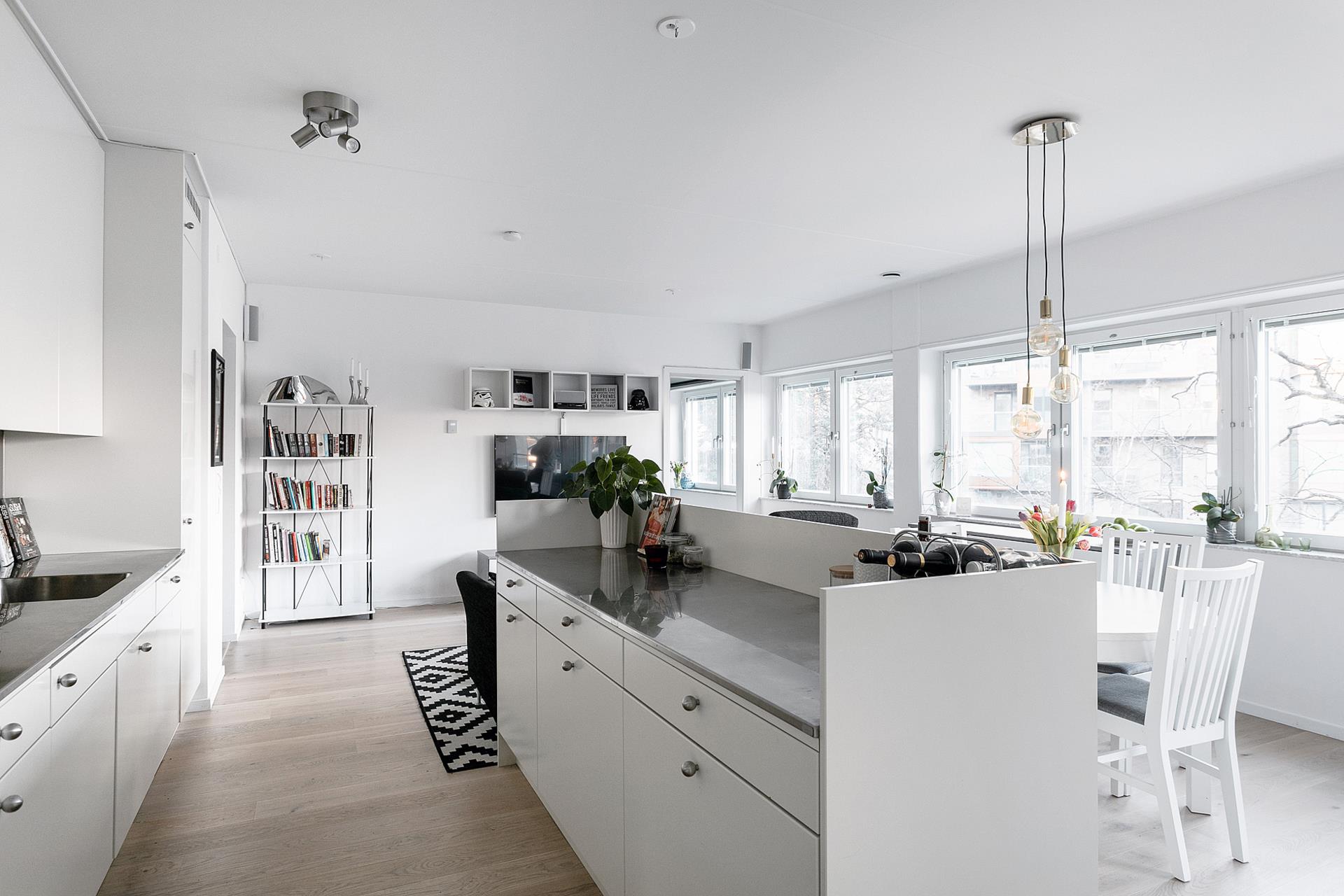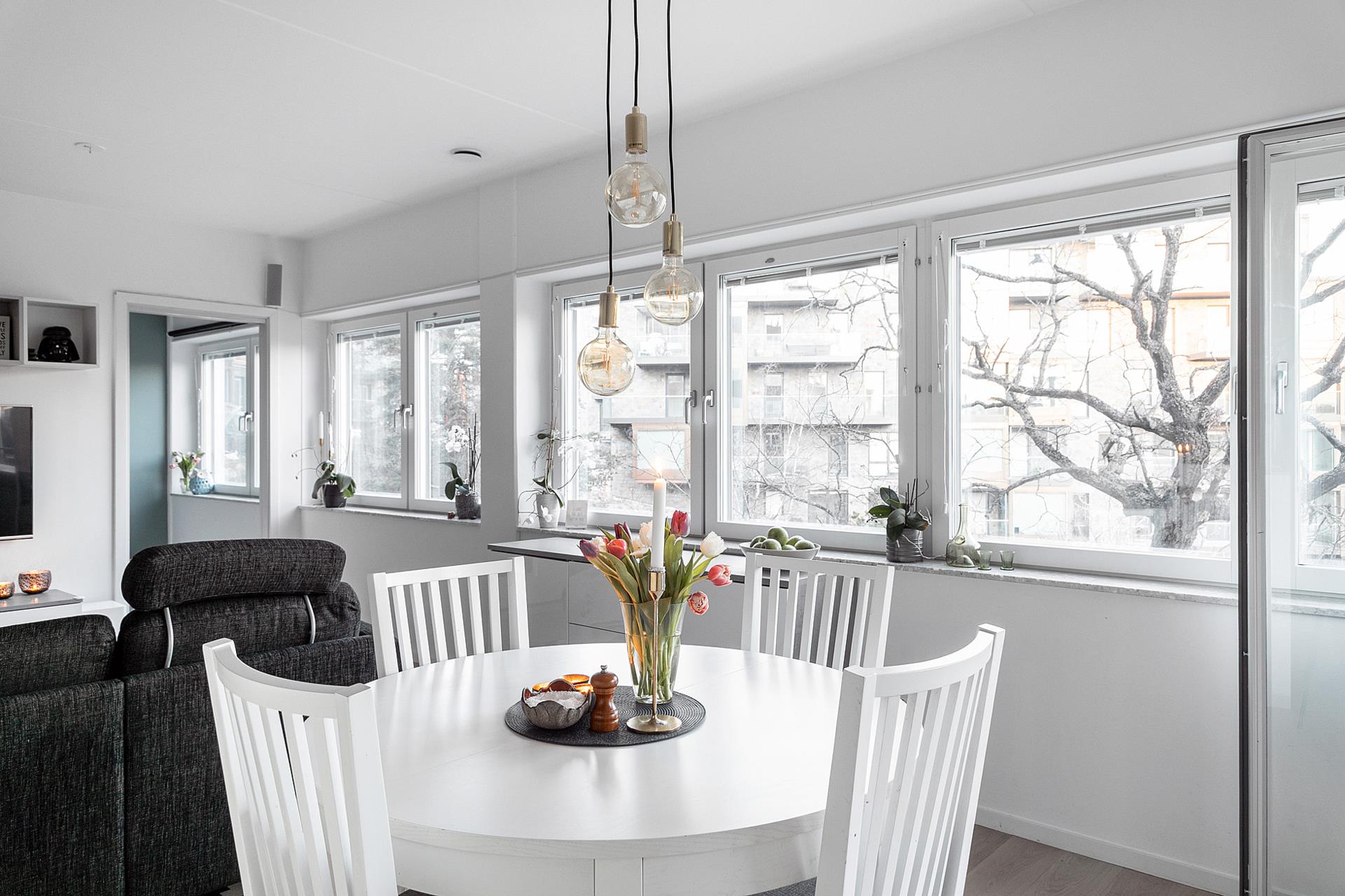 VARDAGSRUMMET är ett fantastiskt sällskapsrum, framför allt tack vare det massiva ljusinsläppet från fönstren längs hela långsidan, som släpper in den maffiga utsikten över kajen och vattnet. Ljuset och den öppna planlösningen som inkluderar köket skapar en väldigt trivsam och social miljö för allt från vardagsliv till umgänge med vänner. Det vackra parkettgolvet är nyinlagt 2019 och väggarna är vita.